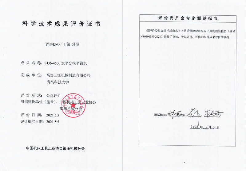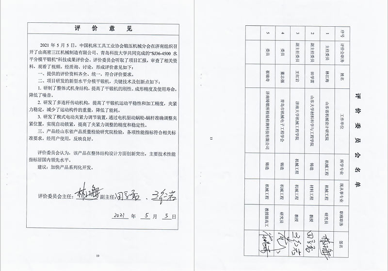 此次,三江同步拿到中國機床鍛壓協會專項技術鑒定報告,以及山東省質量檢測院檢測報告,意味著三江機械研制的SJD11系列新型水平分模平鍛機,已處于國內領先水平,填補了多項國內技術空白。SJD11系列平鍛機結構先進、剛性強、速度快、質量穩定,各項關鍵指標都從專利、著作權、實測數據等各方面進行了充分證明,經過了專家組的嚴密審核和鑒定,最終得到了各方評委的一致認可。